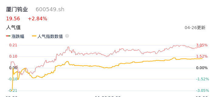 04月26日,厦门钨业收报19.56,股价涨幅2.84%,成交金额4.23亿元,换手率1.55%。
