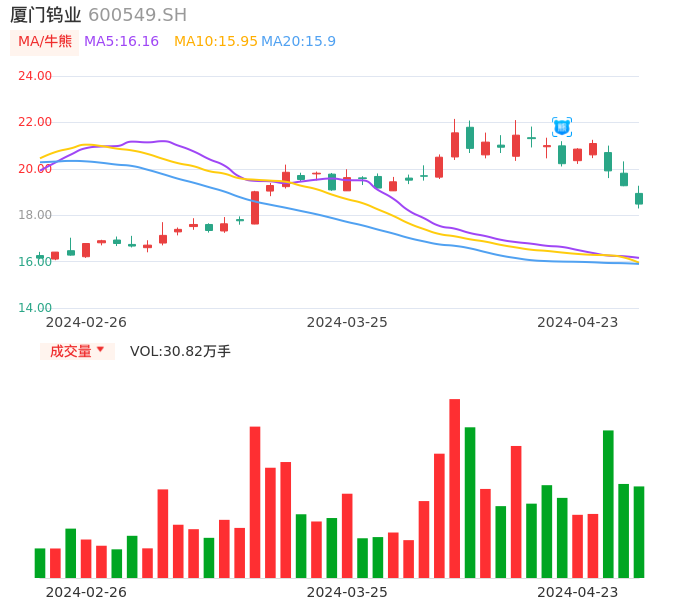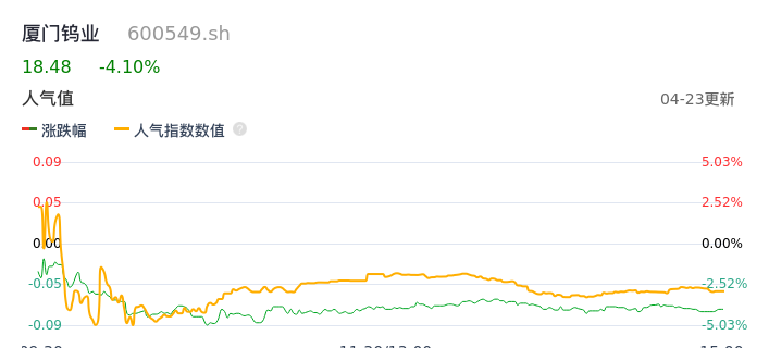 04月23日,厦门钨业收报18.48,股价涨幅-4.10%,成交金额5.73亿元,换手率2.18%。