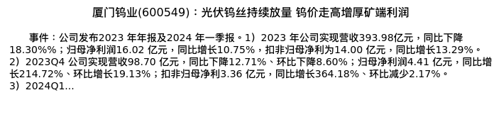 值得注意的是:2024年04月民生证券的邱祖学/孙二春分析师,首次发布关于厦门钨业的研究报告,标题为:厦门钨业(600549):光伏钨丝持续放量 钨价走高增厚矿端利润。