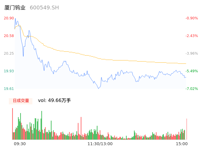 04月19日,厦门钨业收报19.91,股价涨幅-5.60%,成交金额9.96亿元,换手率3.51%。