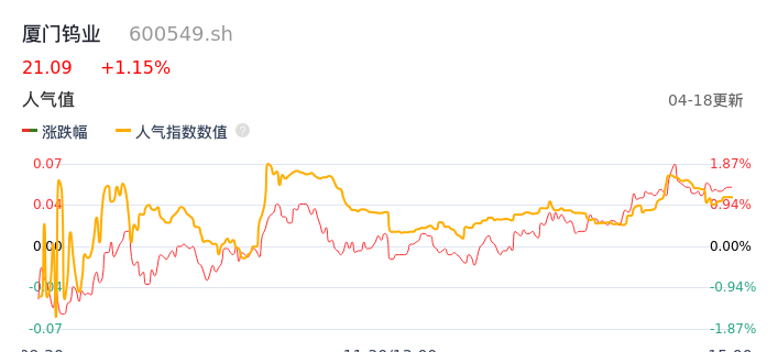 04月18日,厦门钨业收报21.09,股价涨幅1.15%,成交金额4.51亿元,换手率1.52%。