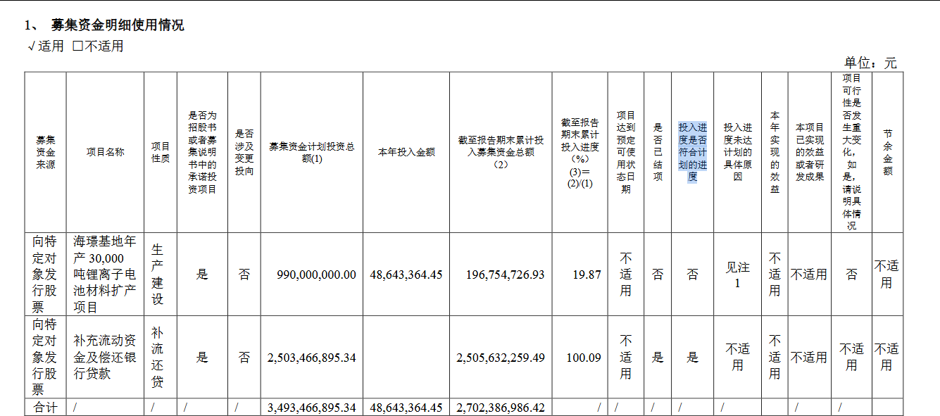 国内市场新增产能方面,报告期内,厦钨新能海璟基地“年产30000吨锂离子电池材料扩产项目”累计投入金额1.97亿元,累计投入进度19.87%,投入进度并不符合计划的进度。据悉,该募投项目原预计达到可使用状态日期为2024年6月,因市场环境变化等因素,延期至2025年12月。