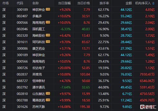 龙虎榜中涉及机构专用席位的个股中,单日净买入额前三为多氟多、国机精工、康芝药业,分别为2.1亿元、2亿元、1.51亿元。