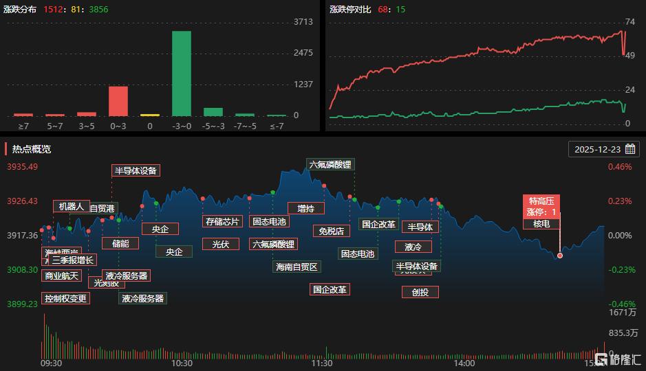 12月23日,A股三大指数冲高回落,沪指涨0.07%报3919点,深证成指涨0.27%,创业板指涨0.41%。全市场超3800股下跌。市场热点聚焦氟化工、玻璃玻纤、有机硅板块。