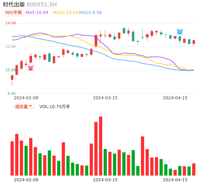 04月15日,时代出版收报12.53,股价涨幅2.45%,成交金额1.33亿元,换手率2.22%。