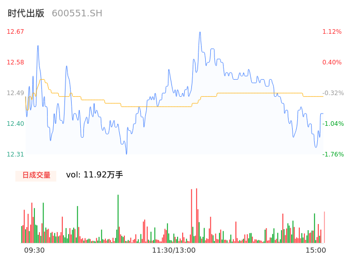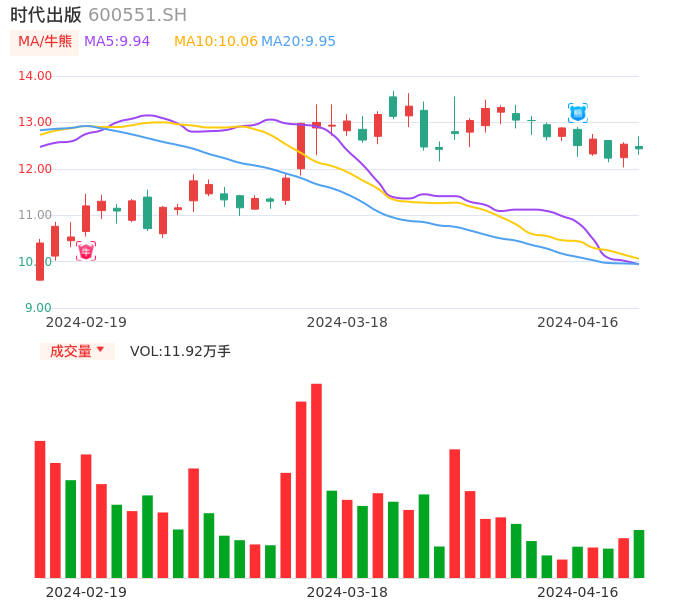 04月16日,时代出版收报12.43,股价涨幅-0.80%,成交金额1.49亿元,换手率2.46%。
