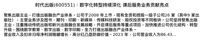值得注意的是:2024年04月海通证券的毛云聪/孙小雯/陈星光/康百川分析师,首次发布关于时代出版的研究报告,标题为:时代出版(600551):数字化转型持续深化 课后服务业务贡献亮点。