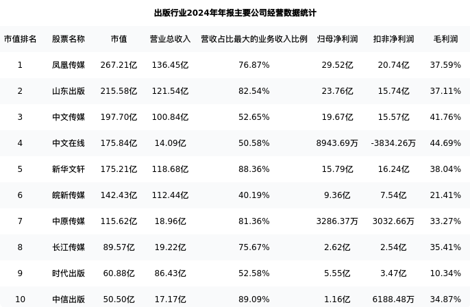 时代出版最新报告期数据为年报,下表汇总了出版行业内市值靠前的公司年报主要经营数据