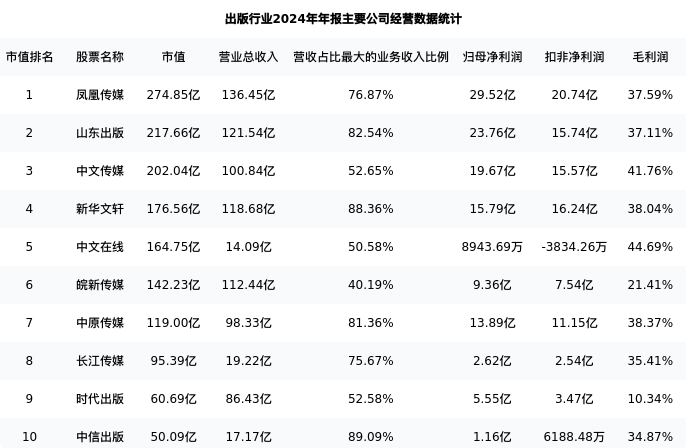 时代出版最新报告期数据为年报,下表汇总了出版行业内市值靠前的公司年报主要经营数据