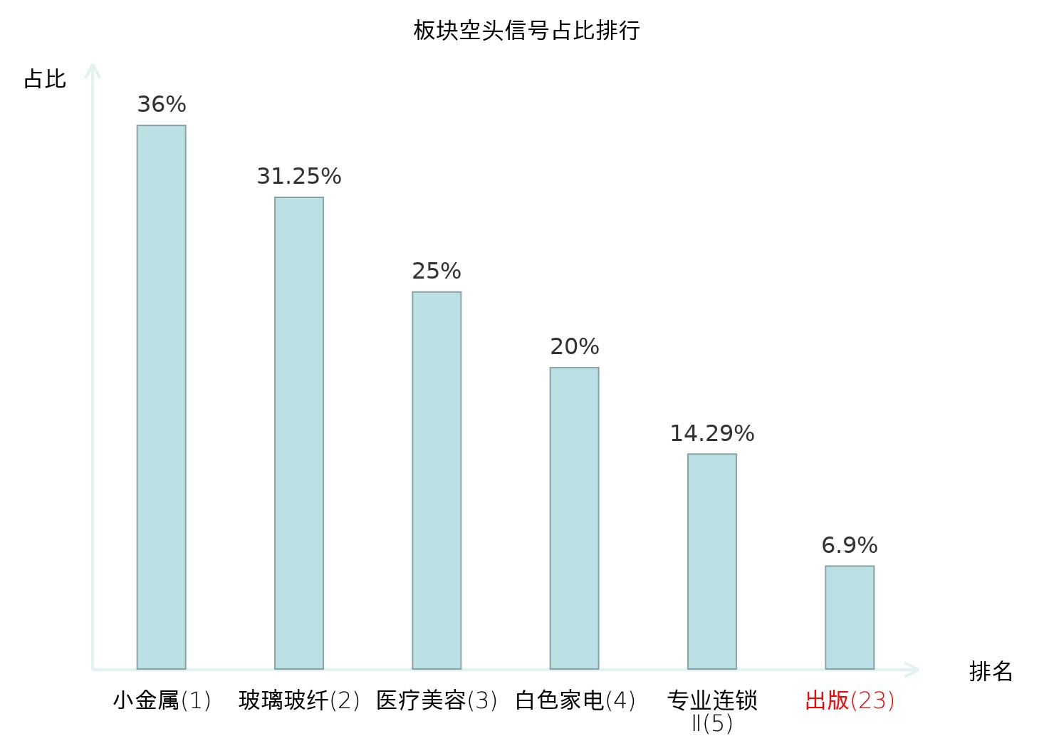全市场所有行业板块中主力空头信号占比排名中,小金属板块位居第一。光伏设备板块名次提升最快,较昨日上升97位。