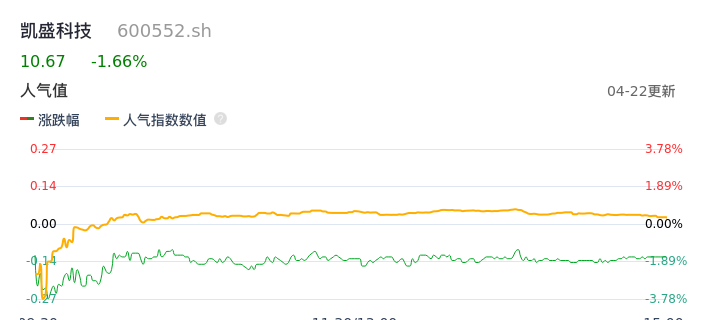 04月22日,凯盛科技收报10.67,股价涨幅-1.66%,成交金额1.93亿元,换手率2.03%。