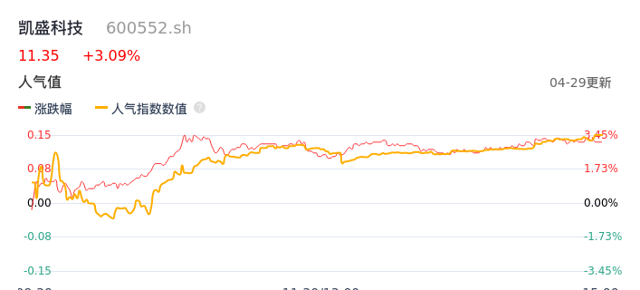 04月29日,凯盛科技收报11.35,股价涨幅3.09%,成交金额1.76亿元,换手率1.74%。