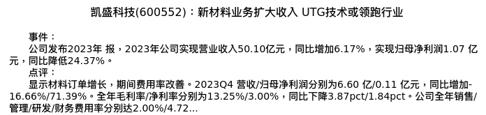 值得注意的是:2024年04月东北证券的濮阳分析师,首次发布关于凯盛科技的研究报告,标题为:凯盛科技(600552):新材料业务扩大收入 UTG技术或领跑行业。