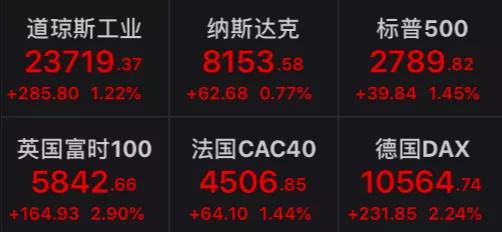 国际油价方面,截至收盘,布伦特原油期货价格下跌2.73%,此前一度大涨10%以上。欧美股市方面,截至收盘,道琼斯工业指数、标普500指数、纳斯达克指数均为上涨状态,分别上涨1.22%、1.45%、0.77%。英国富时100指数、德国DAX指数、法国CAC40指数均出现不同程度上涨。