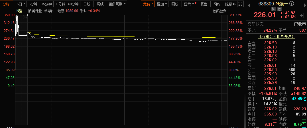 强一股份发行价格85.09元/股,发行市盈率为48.55倍。上市首日开盘价265.60元/股,截至收盘时涨幅达165.61%,报收226.01元/股,收盘后公司市值292.8亿元。若投资者中一签并以今日早盘的最高价276.82元/股卖出,将获利9.59万元。