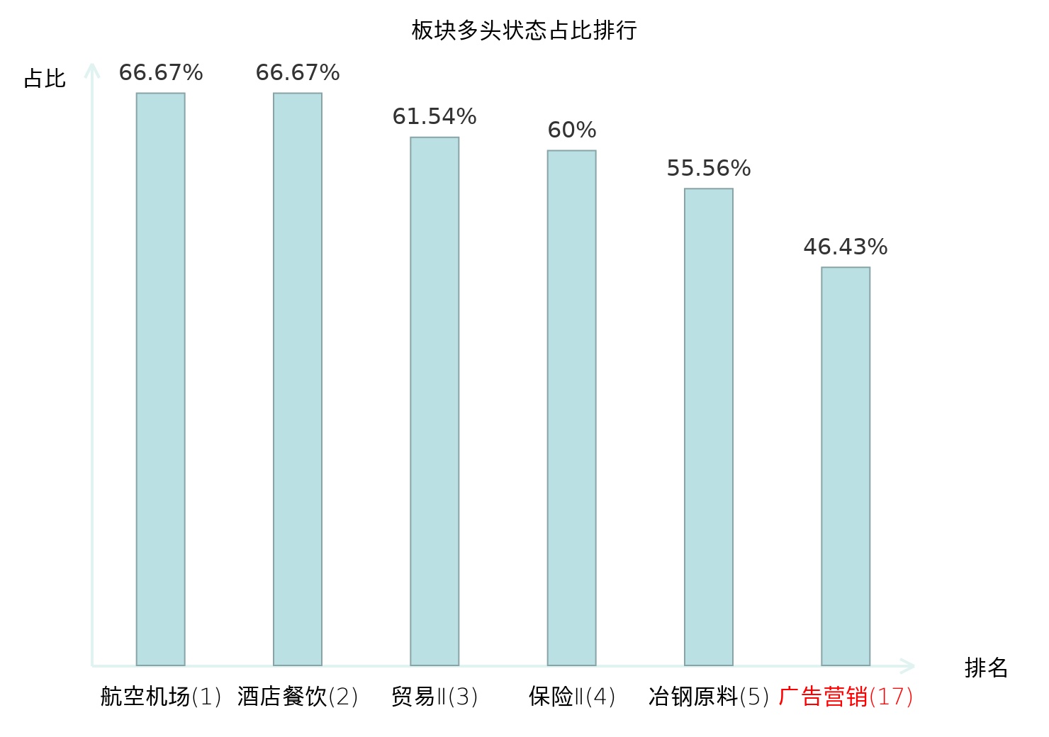 全市场所有行业板块中主力多头状态占比排名中,航空机场板块位居第一。农业综合Ⅱ板块名次提升最快,较昨日上升64位。
