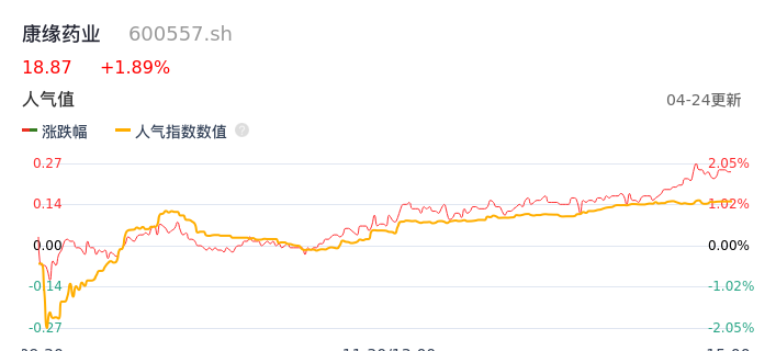 04月24日,康缘药业收报18.87,股价涨幅1.89%,成交金额1.32亿元,换手率1.22%。