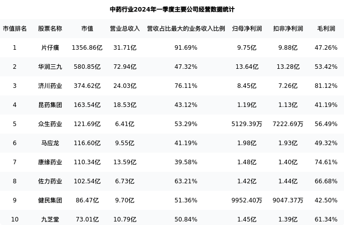 康缘药业最新报告期数据为一季度,下表汇总了中药行业内市值靠前的公司一季度主要经营数据