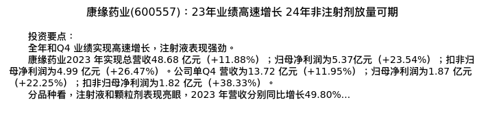 值得注意的是:2024年03月华福证券的盛丽华分析师,首次发布关于康缘药业的研究报告,标题为:康缘药业(600557):23年业绩高速增长 24年非注射剂放量可期。