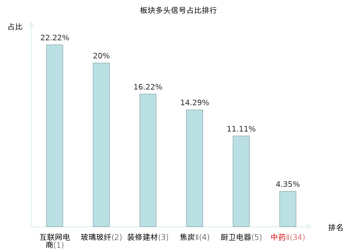 全市场所有行业板块中主力多头信号占比排名中,互联网电商板块位居第一。焦炭Ⅱ板块名次提升最快,较昨日上升118位。