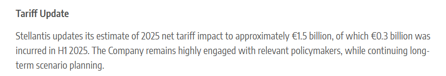 在Stellantis最新的“关税更新”栏目中,公司将2025年预估受到的净关税影响定在15亿欧元附近,其中3亿欧元已经发生在2025年上半年。