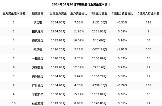 从主力资金流向来看,专用设备行业今日主力资金流入37.87亿元,在所有申万二级行业中排名:105/131。