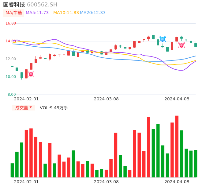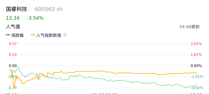 04月08日,国睿科技收报13.34,股价涨幅-3.54%,成交金额1.28亿元,换手率0.77%。