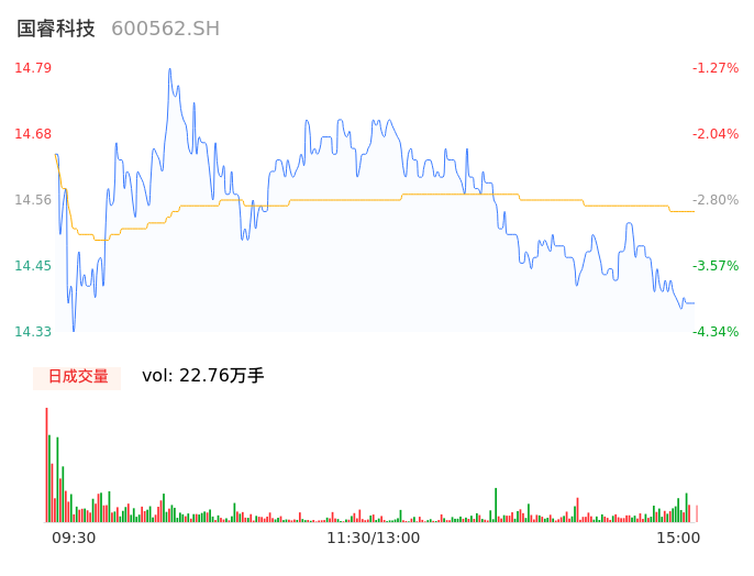 04月23日,国睿科技收报14.38,股价涨幅-4.01%,成交金额3.31亿元,换手率1.86%。