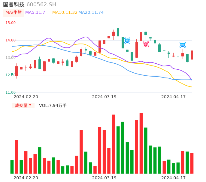 国睿科技近期出现日线级别熊点,且60分钟级别也处于熊点区间,股价处于偏弱行情,建议谨慎观望。