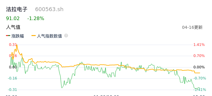 04月16日,法拉电子收报91.02,股价涨幅-1.28%,成交金额2.02亿元,换手率0.98%。
