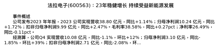 值得注意的是:2024年03月中泰证券的王芳/刘博文分析师,首次发布关于法拉电子的研究报告,标题为:法拉电子(600563):23年稳健增长 持续受益新能源发展。