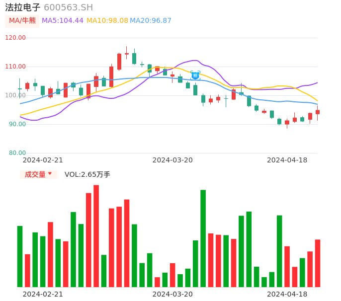 04月18日,法拉电子收报94.84,股价涨幅1.10%,成交金额2.51亿元,换手率1.18%。