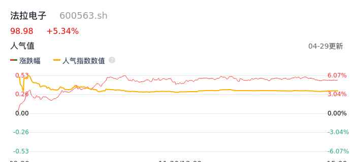 04月29日,法拉电子收报98.98,股价涨幅5.34%,成交金额3.19亿元,换手率1.45%。