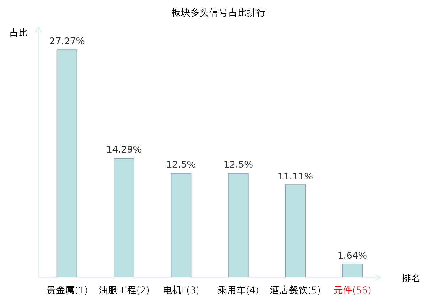 全市场所有行业板块中主力多头信号占比排名中,贵金属板块位居第一。乘用车板块名次提升最快,较昨日上升114位。