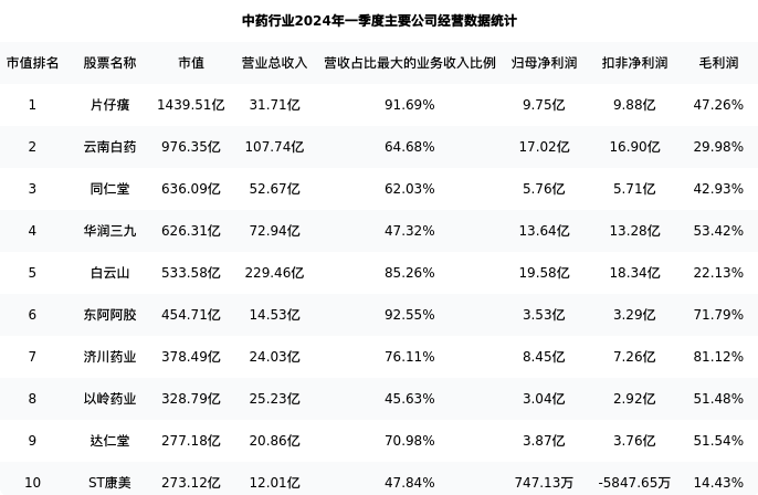 济川药业最新报告期数据为一季度,下表汇总了中药行业内市值靠前的公司一季度主要经营数据