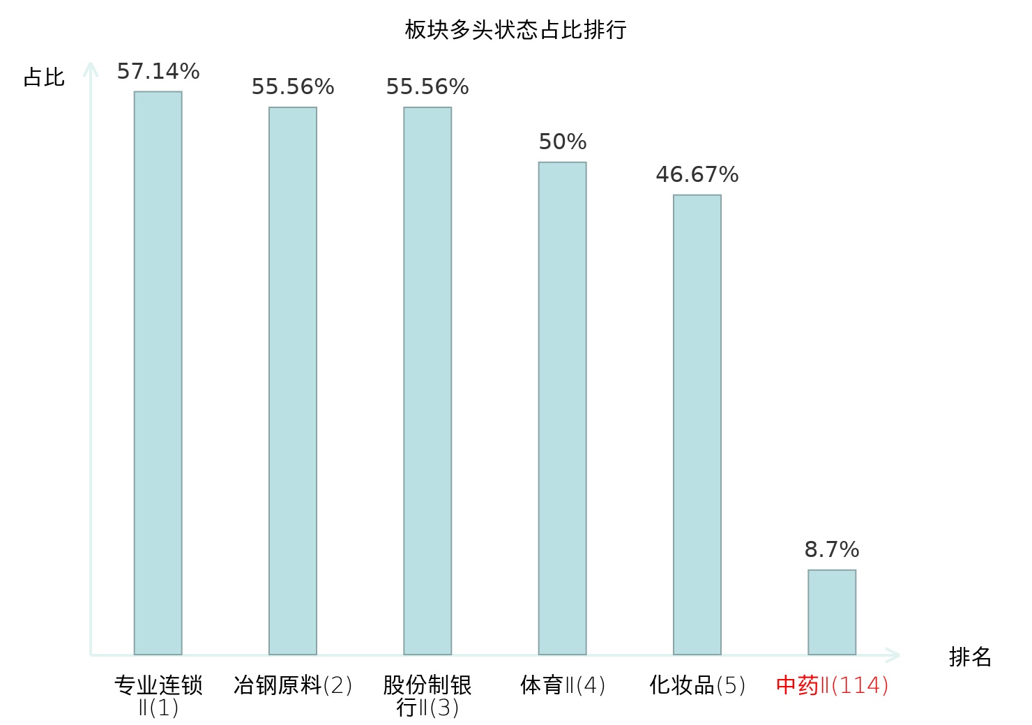 全市场所有行业板块中主力多头状态占比排名中,专业连锁Ⅱ板块位居第一。乘用车板块名次提升最快,较昨日上升85位。