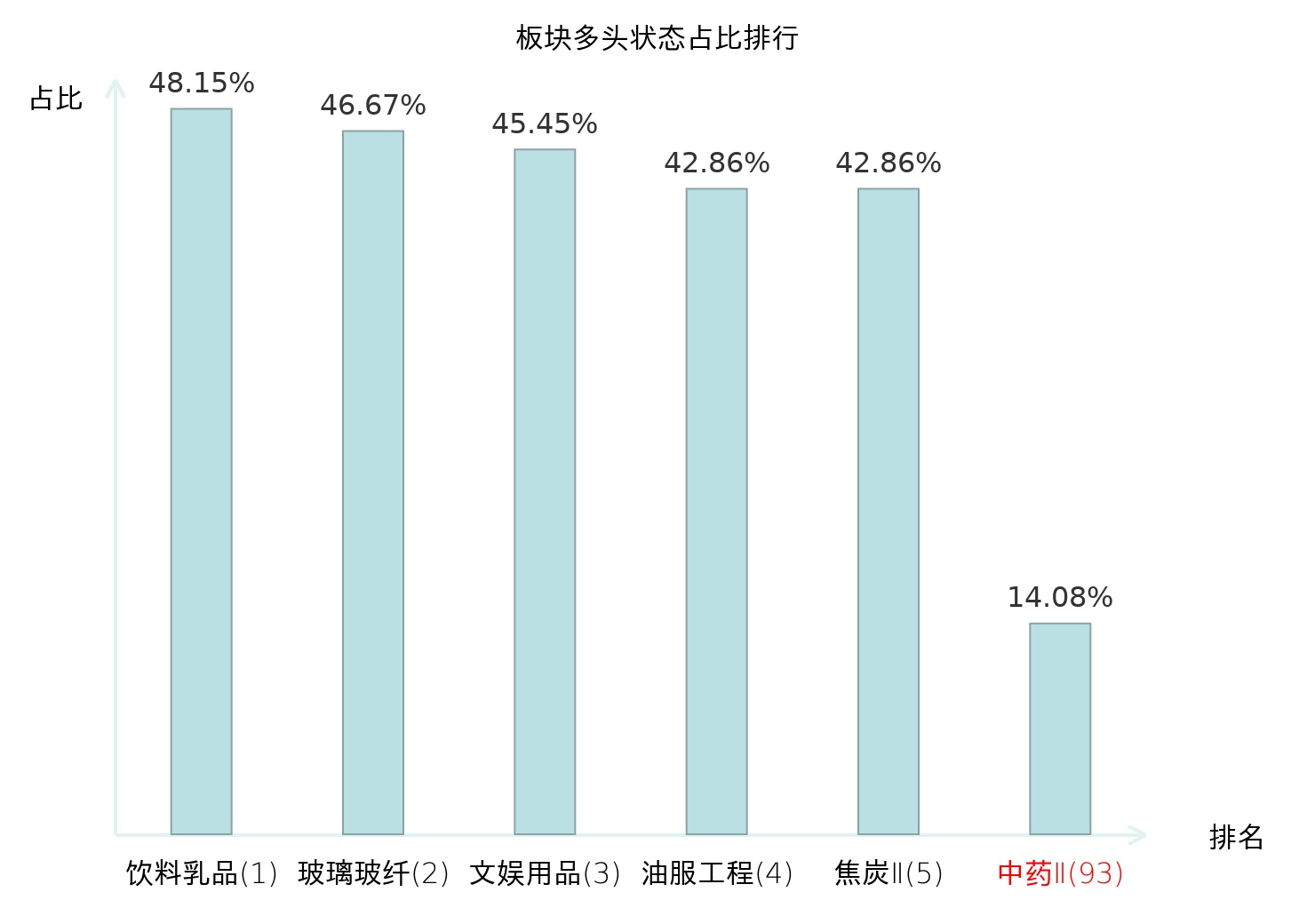 全市场所有行业板块中主力多头状态占比排名中,饮料乳品板块位居第一。商用车板块名次提升最快,较昨日上升77位。