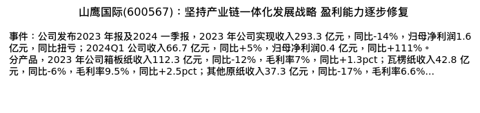 值得注意的是:2024年04月方正证券的李珍妮/马萤分析师,首次发布关于山鹰国际的研究报告,标题为:山鹰国际(600567):坚持产业链一体化发展战略 盈利能力逐步修复。