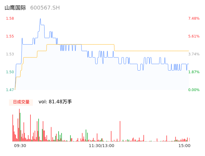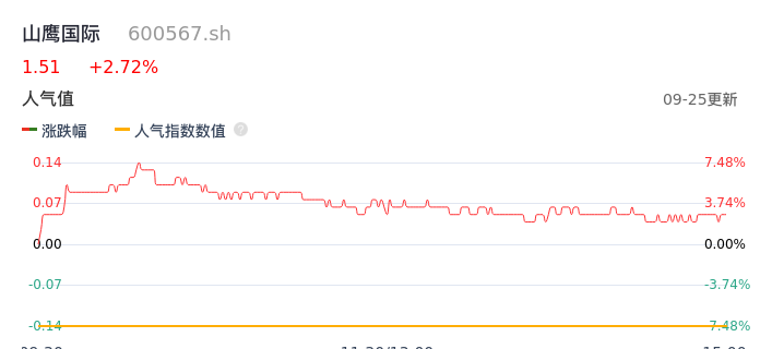 09月25日,山鹰国际收报1.51,股价涨幅2.72%,成交金额1.25亿,换手率1.82%。