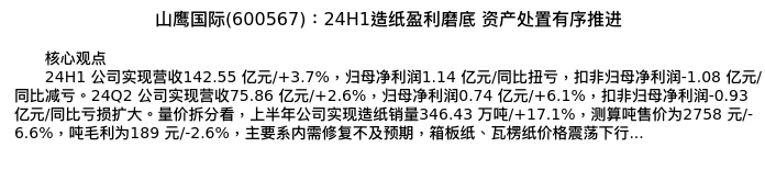 值得注意的是:2024年09月中信建投证券的叶乐/张舒怡分析师,首次发布关于山鹰国际的研究报告,标题为:山鹰国际(600567):24H1造纸盈利磨底 资产处置有序推进。