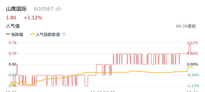 04月26日,山鹰国际收报1.80,股价涨幅1.12%,成交金额4980.40万元,换手率0.63%。