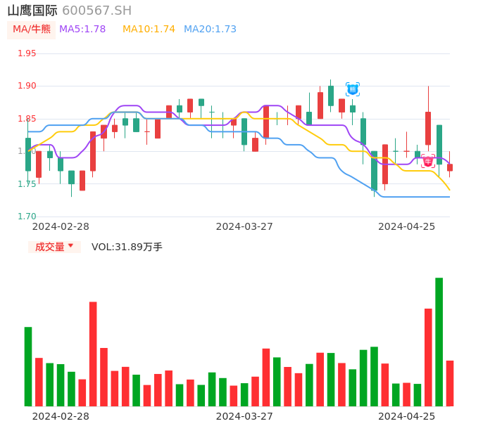 04月25日,山鹰国际收报1.78,股价涨幅0.00%,成交金额5684.51万元,换手率0.71%。