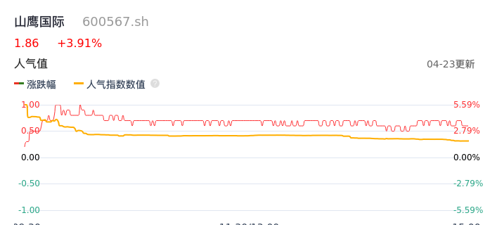 04月23日,山鹰国际收报1.86,股价涨幅3.91%,成交金额1.05亿元,换手率1.27%。
