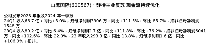 值得注意的是:2024年04月天风证券的孙海洋分析师,首次发布关于山鹰国际的研究报告,标题为:山鹰国际(600567):静待主业复苏 现金流持续优化。