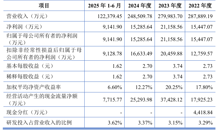 财务方面,于2022年、2023年、2024年及2025年1-6月,公司实现营业收入分别约为28.79亿元、28亿元、24.85亿元、12.24亿元人民币;同期净利润分别约为1.54亿元、2.12亿元、1.53亿元、9141.9万元人民币。