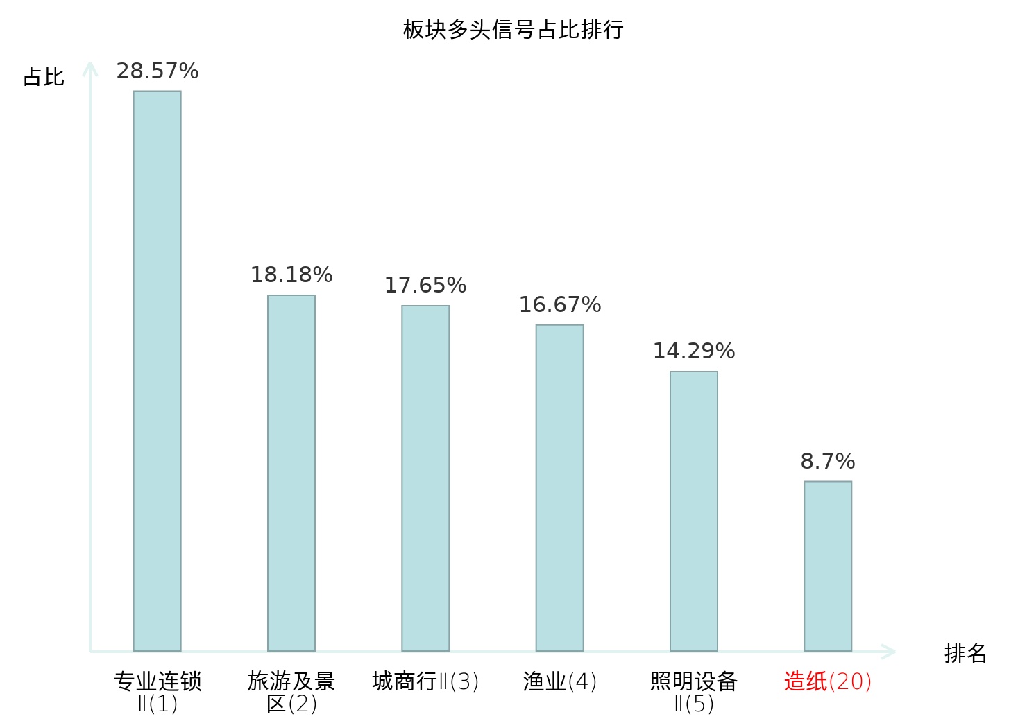 全市场所有行业板块中主力多头信号占比排名中,专业连锁Ⅱ板块位居第一。专业连锁Ⅱ板块名次提升最快,较昨日上升120位。