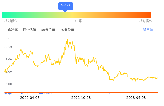 ST中珠当前市净率PB为0.98,在所属的医疗服务中,市净率PB排1,前五名分别为ST中珠市净率0.98、创新医疗市净率1.64、睿智医药市净率1.69、贝瑞基因市净率1.95、诚达药业市净率1.98。ST中珠当前市净率PB为0.98,超过近3年59.95%的历史数据。