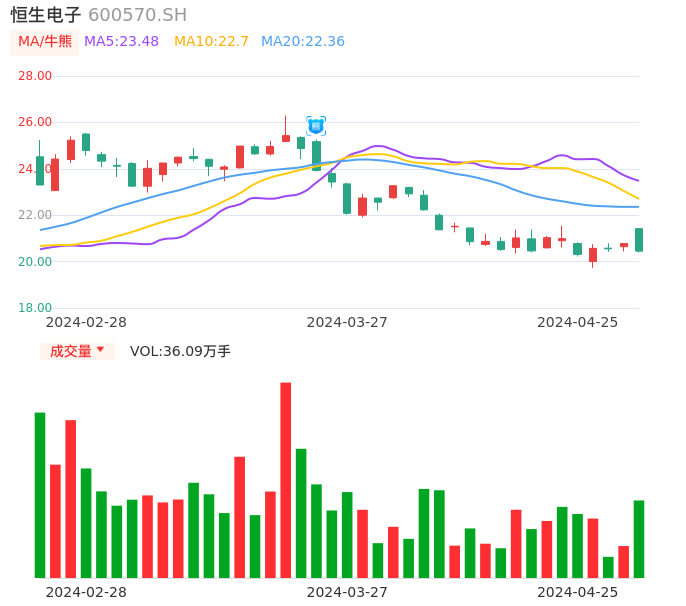04月25日,恒生电子收报20.45,股价涨幅-1.59%,成交金额7.47亿元,换手率1.91%。