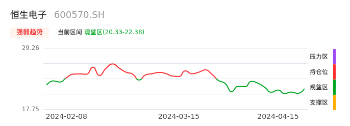 我们来看一下该股的九方特色指标强弱趋势的情况:恒生电子自03月25日从持仓区下穿到观望区。股价近期持续下跌后,短期出现止跌迹象。后续重点关注能否再次站上多空分界点:22.38元。如未能有效突破则可能进入新一轮空头行情。