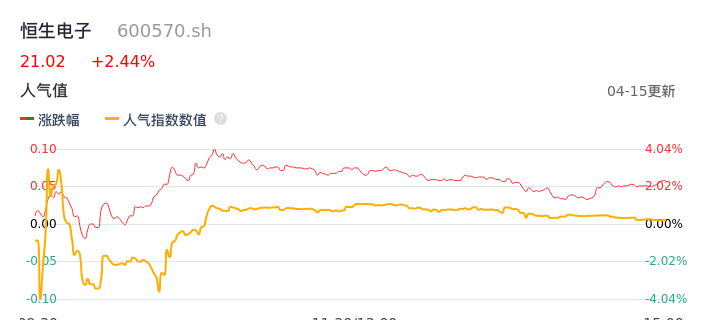 04月15日,恒生电子收报21.02,股价涨幅2.44%,成交金额6.89亿元,换手率1.74%。